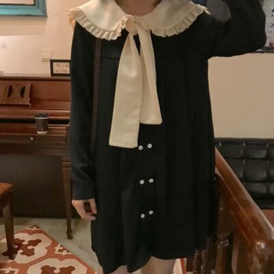 秋 冬 レディース ワンピース ひざ丈ワンピ ブラック 黒 レトロ カジュアル ハイウエスト リボン かわいい おしゃれ 韓国 きれいめ プチプラ FA-9-215 | dress_sugar_moon