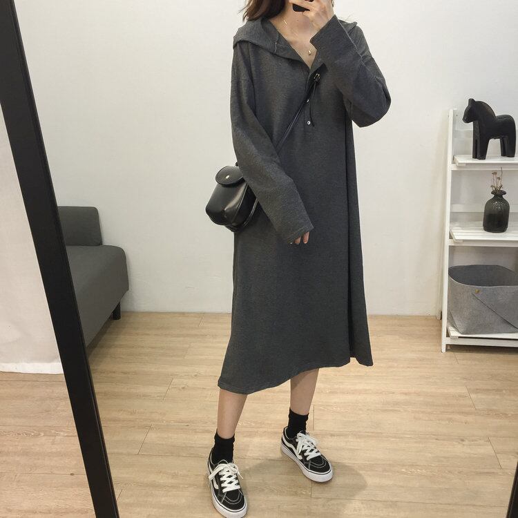秋 冬 レディース ワンピース ロングワンピース グレー 灰色 カジュアル フード付き 長袖 シンプル かわいい おしゃれ 韓国 きれいめ プチプラ FA-10-6 | dress_sugar_moon