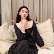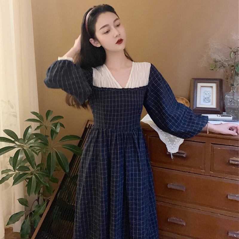秋 冬 レディース ワンピース ロングワンピース チェック柄 Vネック レトロ ハイウエスト スリム かわいい おしゃれ 韓国 きれいめ プチプラ FA-10-10 | dress_sugar_moon