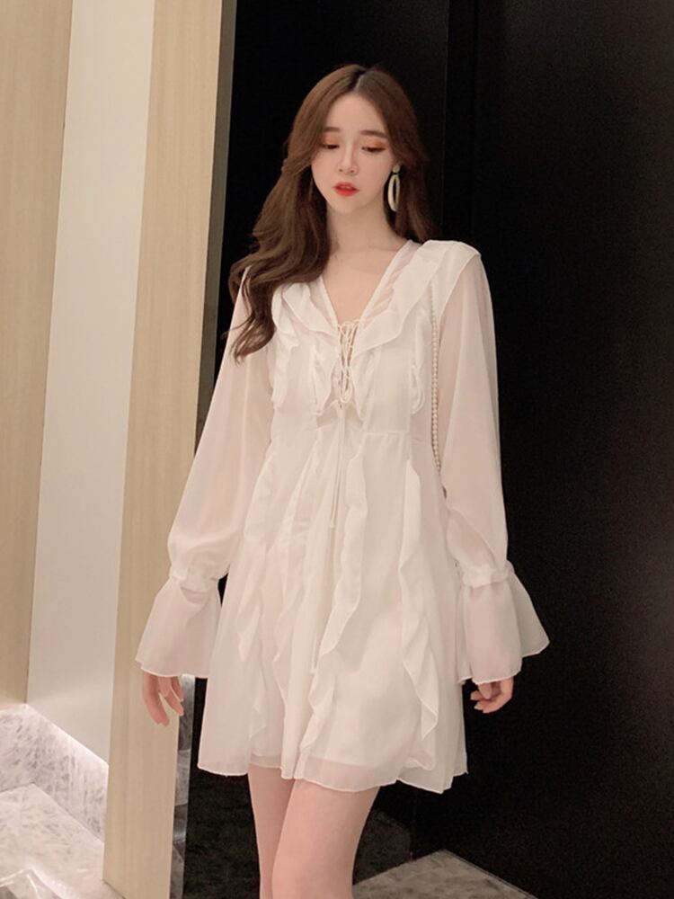 秋 冬 レディース ワンピース ホワイト 白 レトロ Vネック 長袖 トランペットスリーブ ハイウエスト かわいい おしゃれ 韓国 きれいめ プチプラ FA-10-43 | dress_sugar_moon