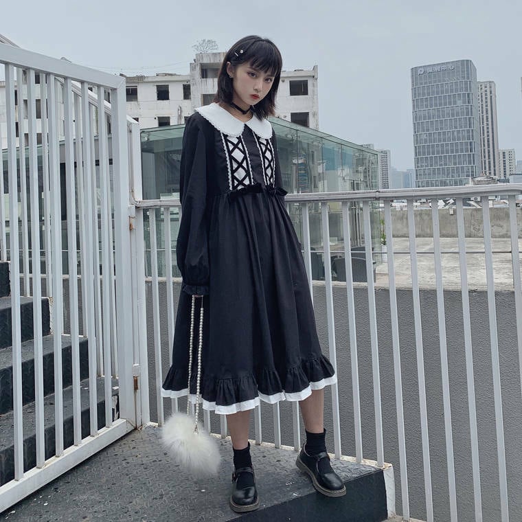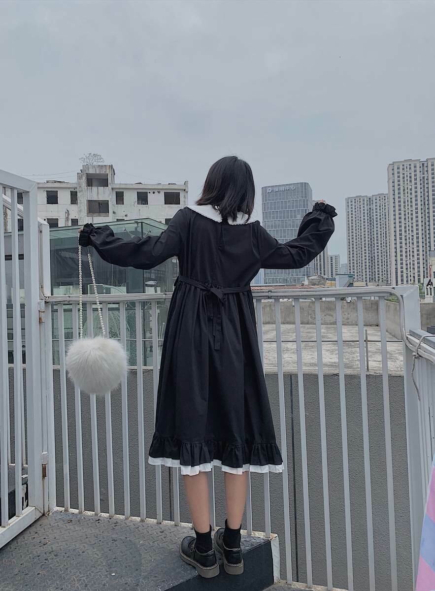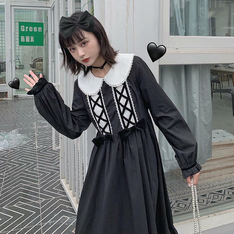 秋 冬 レディース ワンピース ワンサイズ シンプル リボン フリル ゴスロリ ゴシック ロリータ 原宿系 ドールカラー 長袖 普段着 コスプレ イベント用 YN-10-10 | dress_sugar_moon