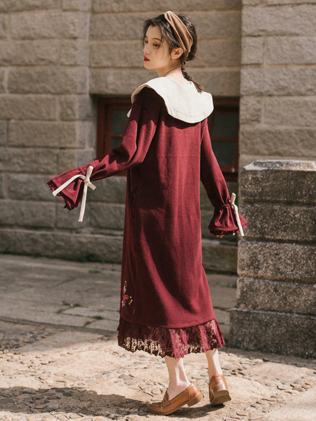 秋 冬 レディース ワンピース ロング丈 ドールカラー 刺繍 花柄刺繍 袖コン 袖リボン 裾レース シースルー 透け クリスマス デート おでかけ レトロ YN-10-11 | dress_sugar_moon