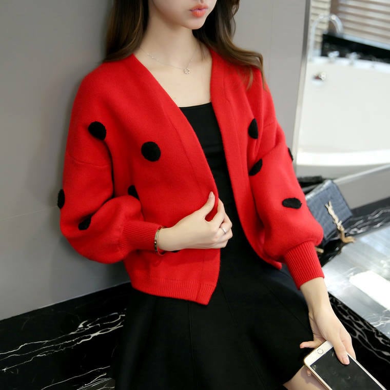 秋 冬 レディース トップス カーディガン アウター ニット ドット柄 水玉 シンプル おしゃれ カジュアル 可愛い 普段着 部屋着 学生 キャンパス デート 赤 黒 ワンサイズ YN-10-22 | dress_sugar_moon