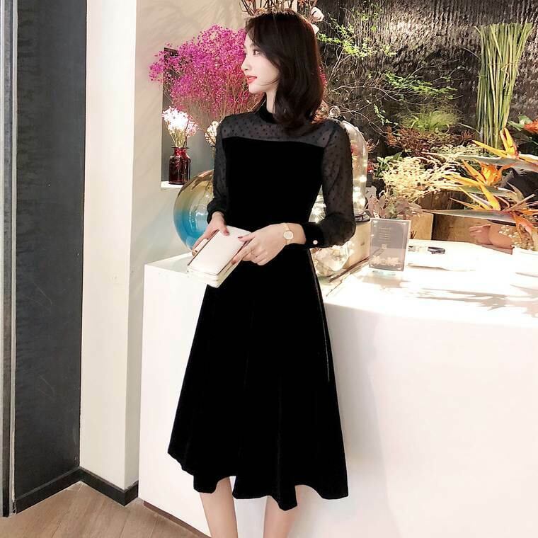 秋 冬 レディース ワンピース ミドル丈 ミドル丈ワンピース ボトルネック シースルー 袖シースルー 透け感 セクシー ドット柄 水玉 7分袖 おしゃれ 大人 可愛い きれいめ 韓国 プチプラ 結婚式 パーティー デート YN-10-42 | dress_sugar_moon