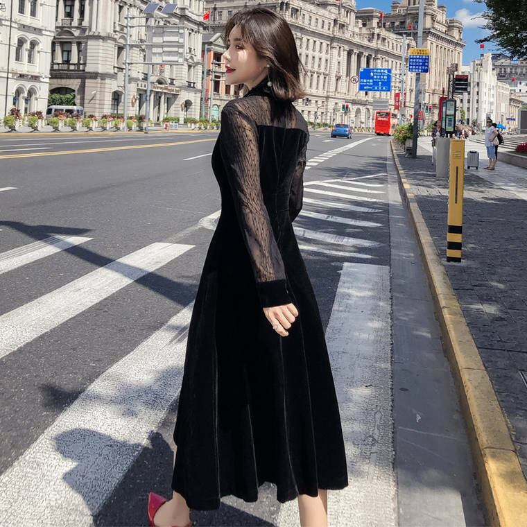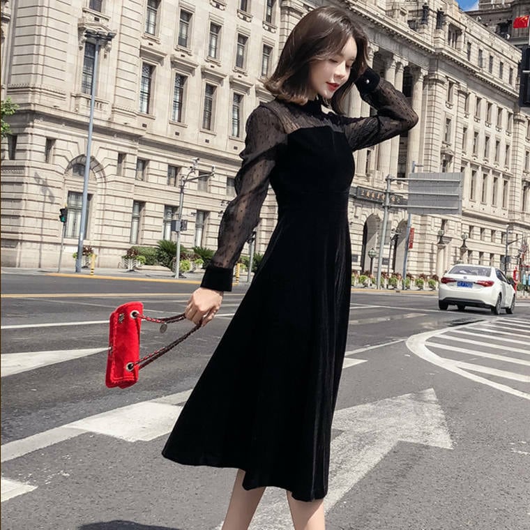 秋 冬 レディース ワンピース ドレス ミドル丈 袖シースルー 透け感 ハイウエスト スリム おしゃれ 上品 大人 パーティー デート 結婚式 ドット柄 水玉 長袖 YN-10-45 | dress_sugar_moon