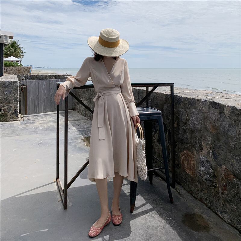 秋 冬 レディース ワンピース ロングワンピース レトロ ハイウエスト 長袖 Vネック アシンメトリー かわいい おしゃれ 韓国 きれいめ プチプラ FA-10-138 | dress_sugar_moon