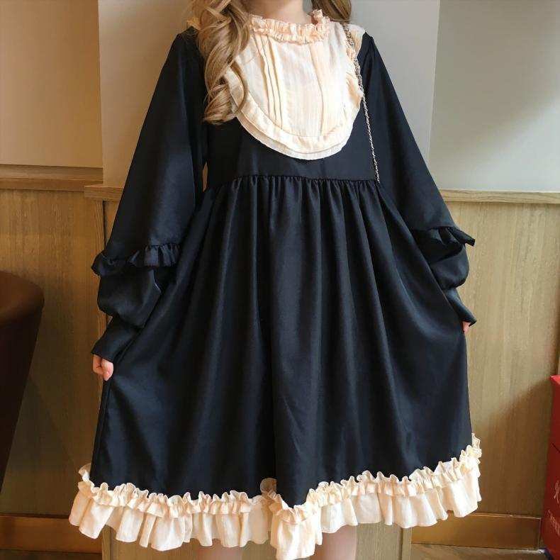 秋 冬 レディース ワンピース ゴスロリ ゴシック ロリータ 長袖 フリル 原宿系 バックリボン 黒 青 2カラー 膝上 ミニ丈 コスプレ イベント YN-10-101 | dress_sugar_moon
