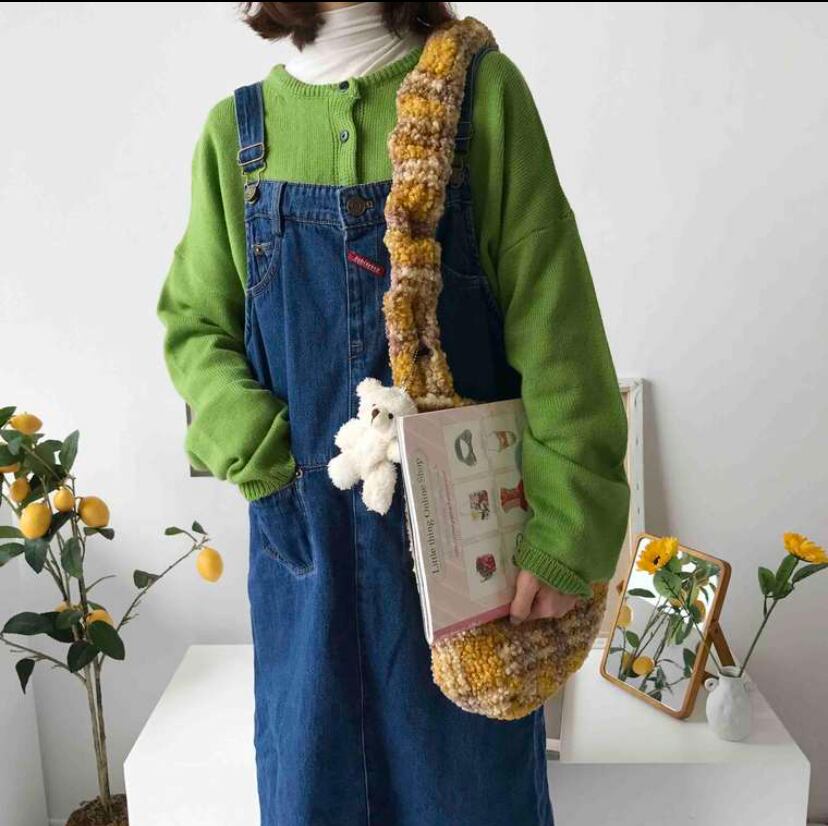 秋 冬 レディース 鞄 バッグ ショルダーバッグ もこもこ ふわもこ 格子 チェック 3カラー 黄 桃 白 リボン くま 原宿系 学生 キャンバス YN-11-59 | dress_sugar_moon
