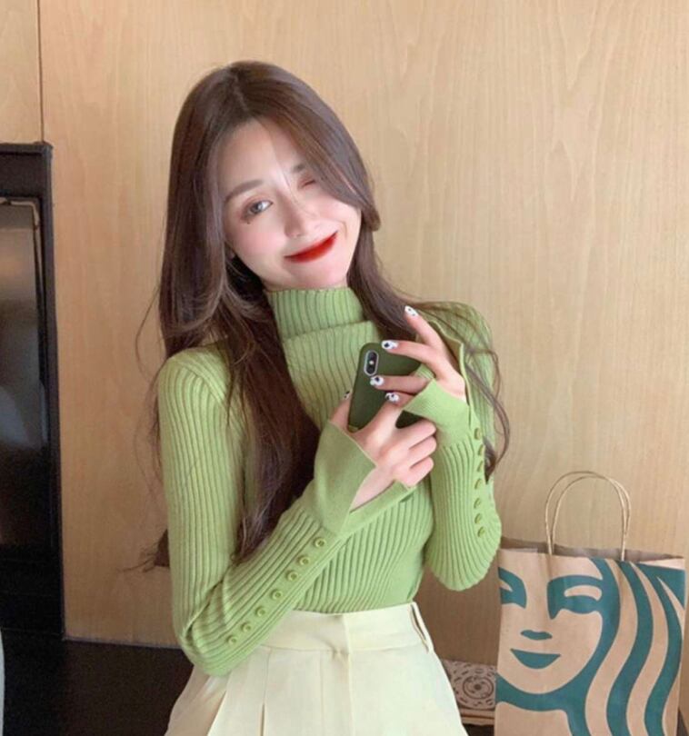 秋 冬 レディース トップス おしゃれ シンプル 可愛い 上品 袖ボタン 5カラー ベージュ 桃 黒 緑 珈琲 スリム タイト 長袖 ボトルネック 韓国 プチプラ きれいめ YN-12-51 | dress_sugar_moon