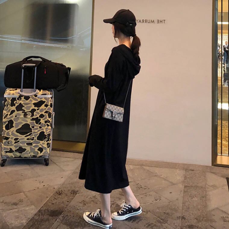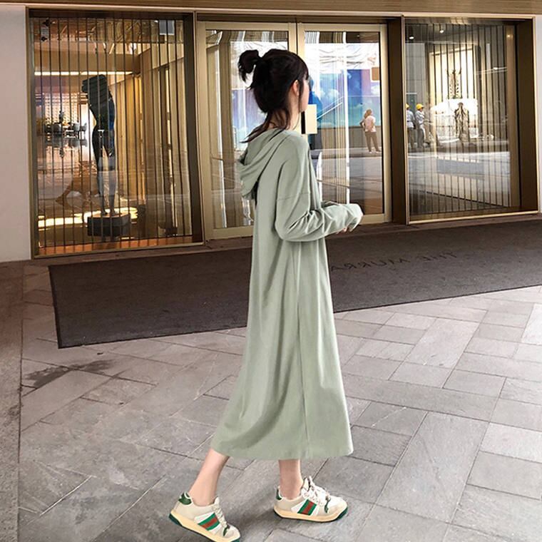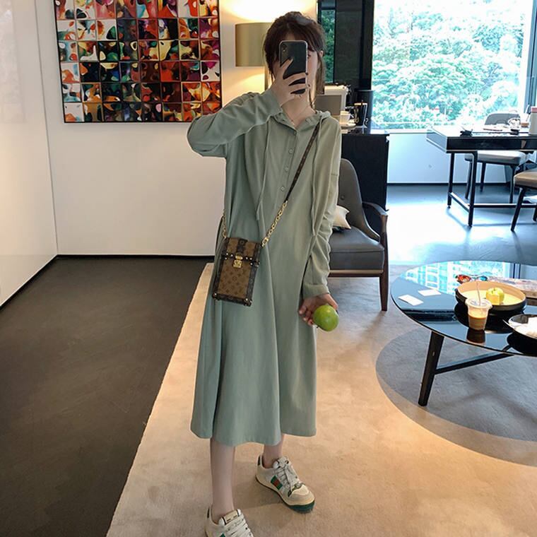 秋 冬 レディース ワンピース 黒 緑 2カラー 綿 おしゃれ シンプル 可愛い 原宿系 Vネック フロントボタン フード付き 韓国 きれいめ プチプラ YN-1-22 | dress_sugar_moon