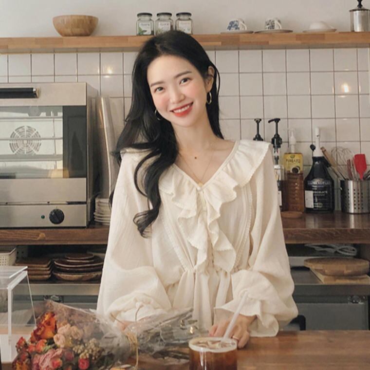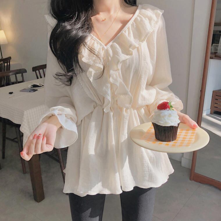 春 夏 レディース シャツ ブラウス トップス 透け おしゃれ 可愛い 上品 フリル ハイウエスト 体型カバー 袖コン 袖コンシャス ワンカラー M L ママコーデ カジュアル ガーリー 韓国 きれいめ プチプラ YN-4-2 | dress_sugar_moon