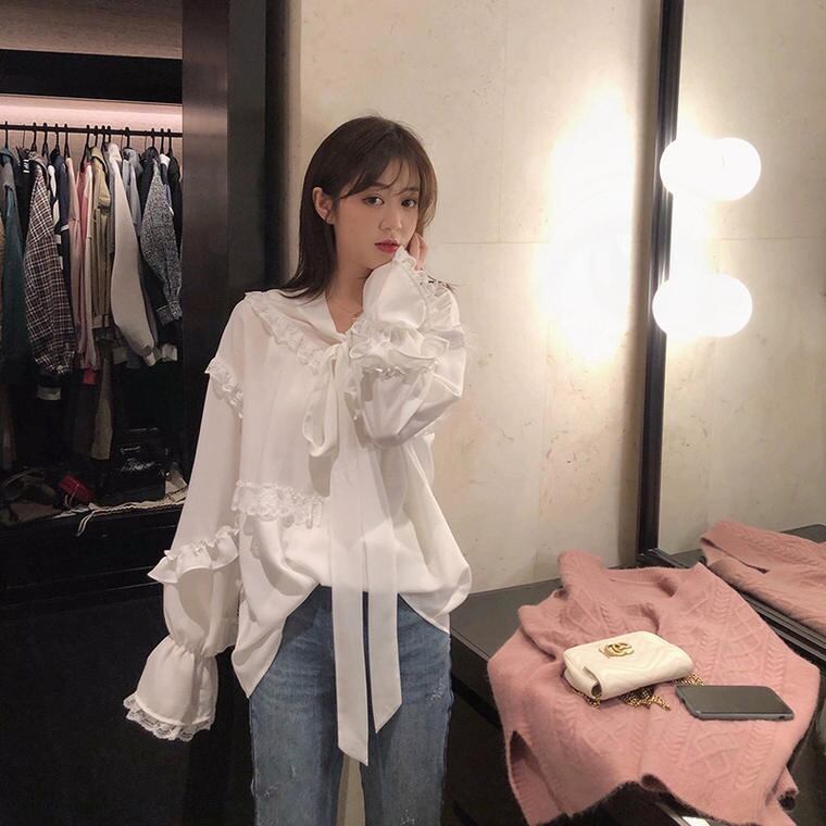 春 夏 レディース ブラウス シャツ おしゃれ 上品 可愛い 透け 袖コン 袖コンシャス リボン ドール 原宿系 オフィス OL S M L 韓国 きれいめ プチプラYN-4-3 | dress_sugar_moon
