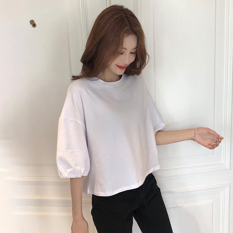 春 夏 レディース トップス Tシャツ 白 ワンカラー シンプル 清楚 爽やか 涼しげ バルーン袖 五分袖 ラウンドネック 大きいサイズ S M L XL 2XL オフィス OL 韓国 きれいめ プチプラ YN-5-17 | dress_sugar_moon