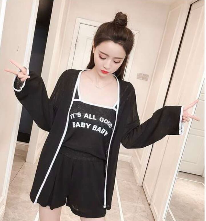 春 夏 レディース ルームウェア パジャマ 新作 2020 おしゃれ スポーティ カジュアル スリーピースセット 3点セット タンクトップ ショートパンツ 長袖カーデ 白 黒 桃 3カラー 韓国 きれいめ プチプラ YN-5-81 | dress_sugar_moon