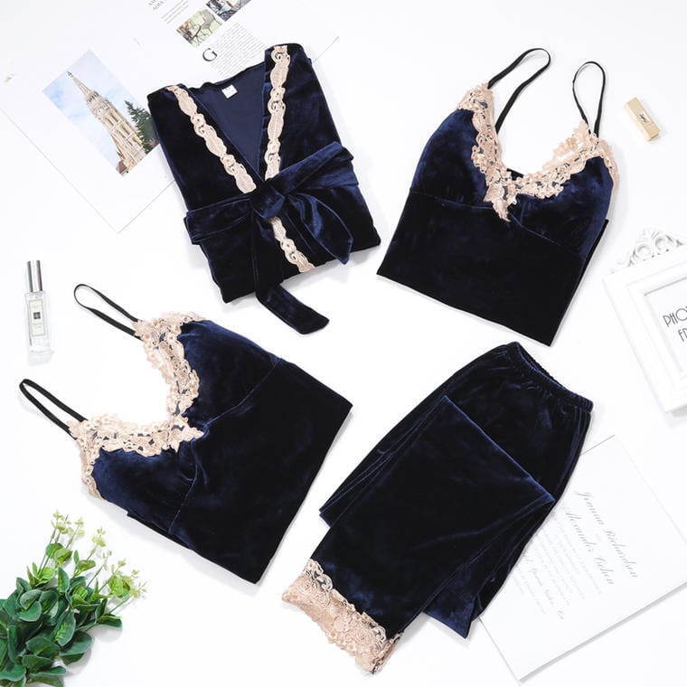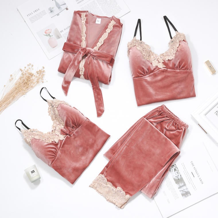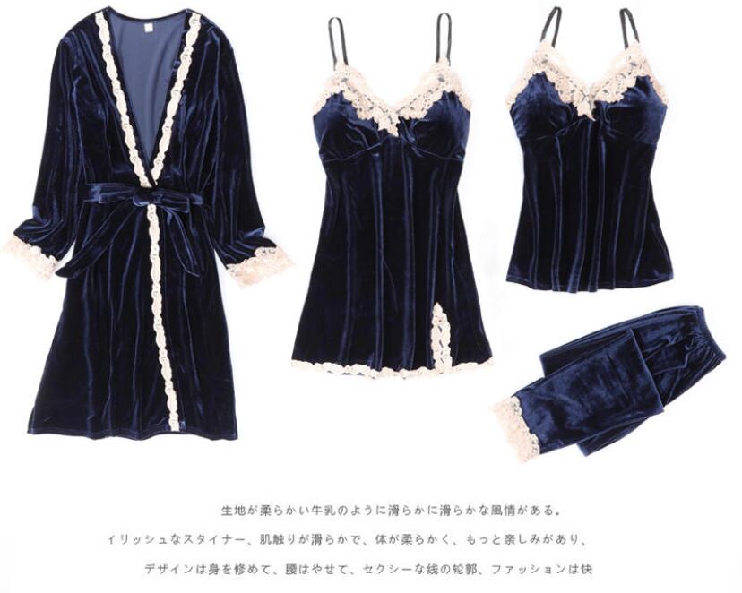春 夏 レディース ルームウェア パジャマ4点セット 4ピース 白レース有 無 赤 灰 紺 桃 カップ付き 大きいサイズ 体型カバー ゆったり 韓国 きれいめ プチプラ YN-5-88 | dress_sugar_moon