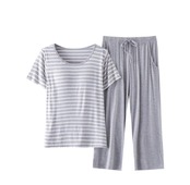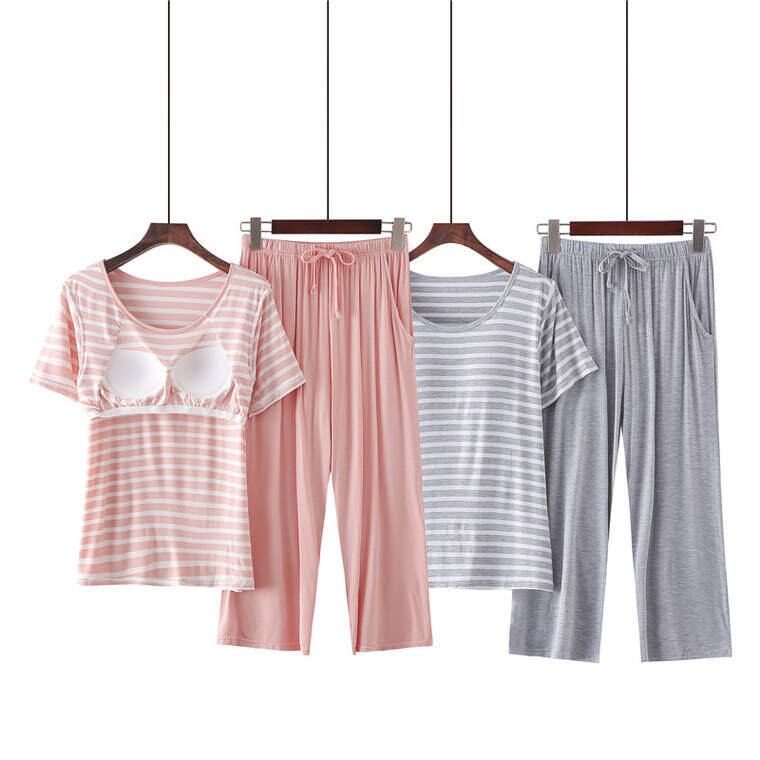 春 夏 レディース ルームウェア パジャマ カップ付き 上下セット ストライプ しましま 長ズボン 大きいサイズ 体型カバー 桃 緑 灰 黒 4カラー 韓国 きれいめ プチプラ YN-5-91 | dress_sugar_moon