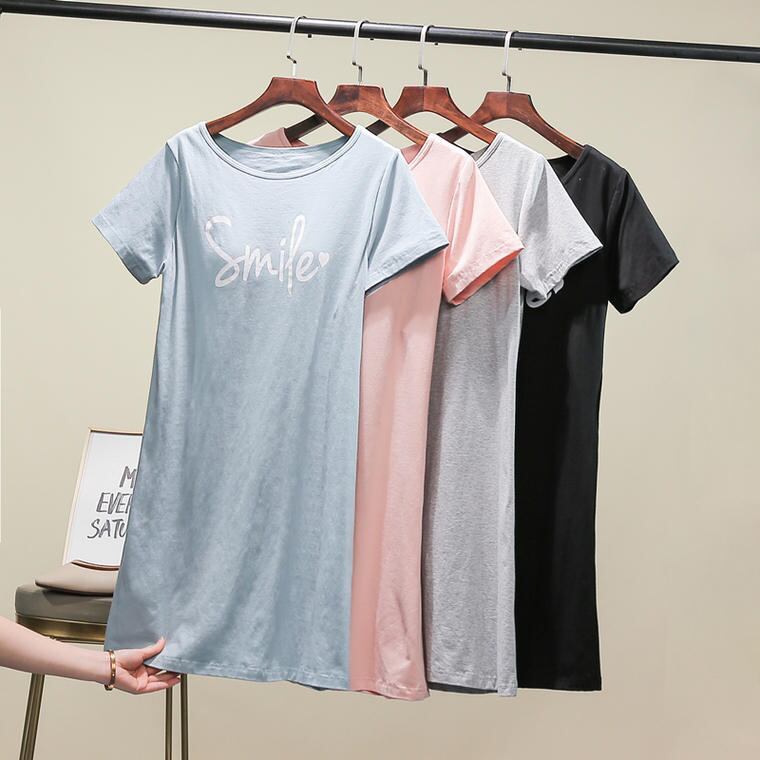 春 夏 レディース ルームウェア パジャマ ワンピース 膝丈 カップ付き Smile シンプル おしゃれ カジュアル 大きいサイズ 体型カバー ゆったり 青 桃 灰 黒 韓国 きれいめ プチプラ YN-5-92 | dress_sugar_moon