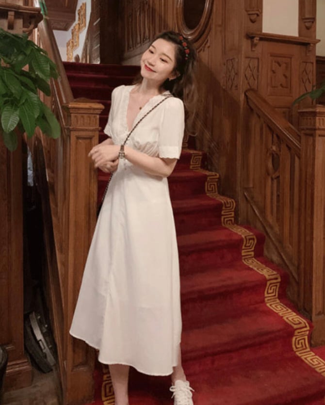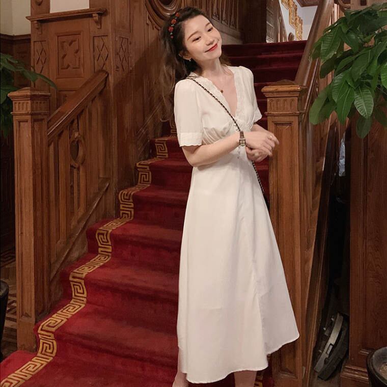 春 夏 レディース ワンピース 半袖 Vネック ロング丈 ロングワンピース 花柄 刺繍 シンプル 清楚 セクシー ワンカラー 白 S M L 韓国 きれいめ プチプラ YN-6-48 | dress_sugar_moon