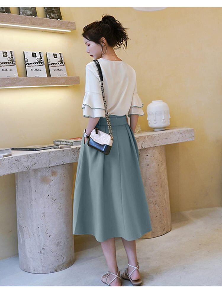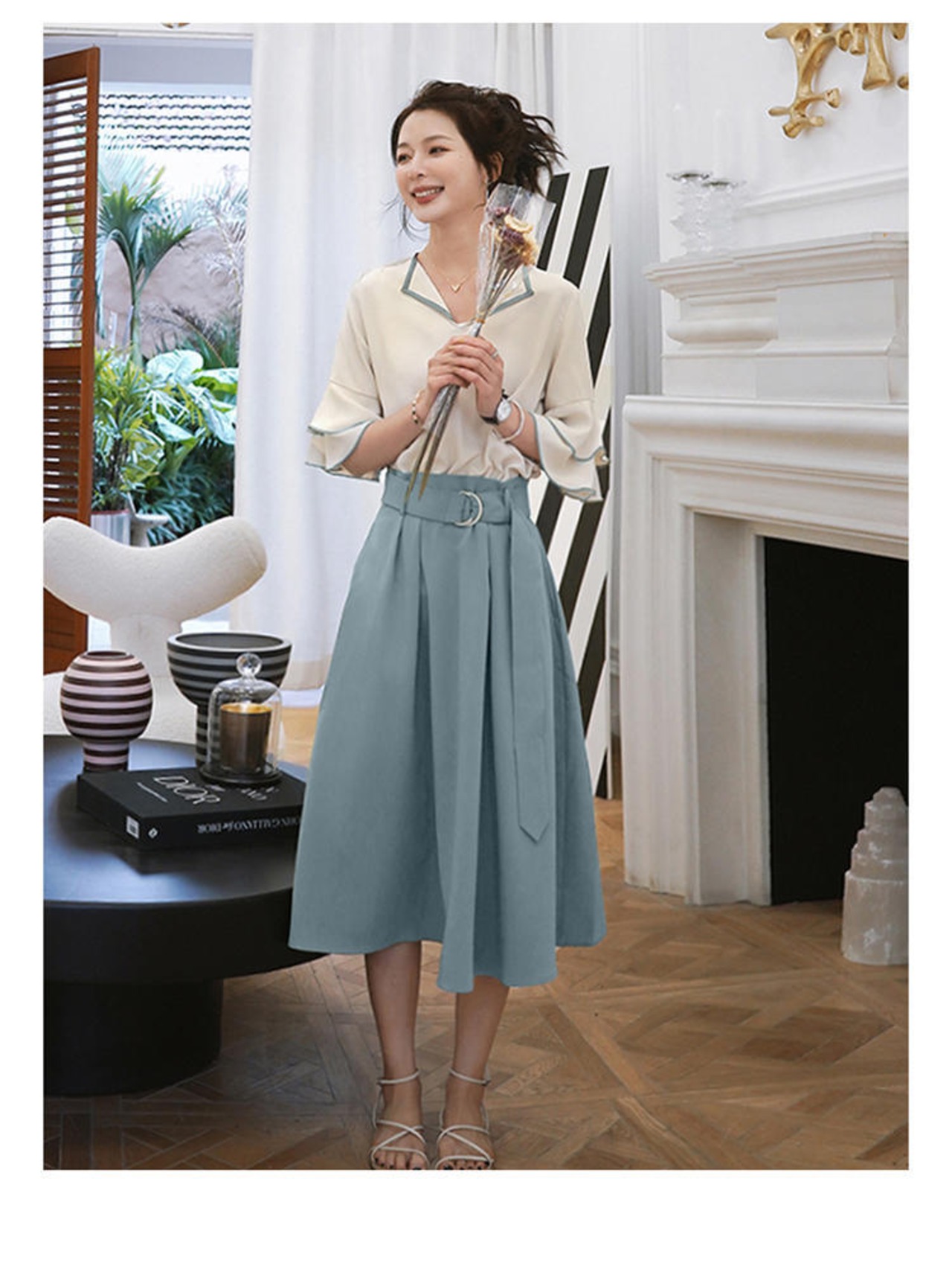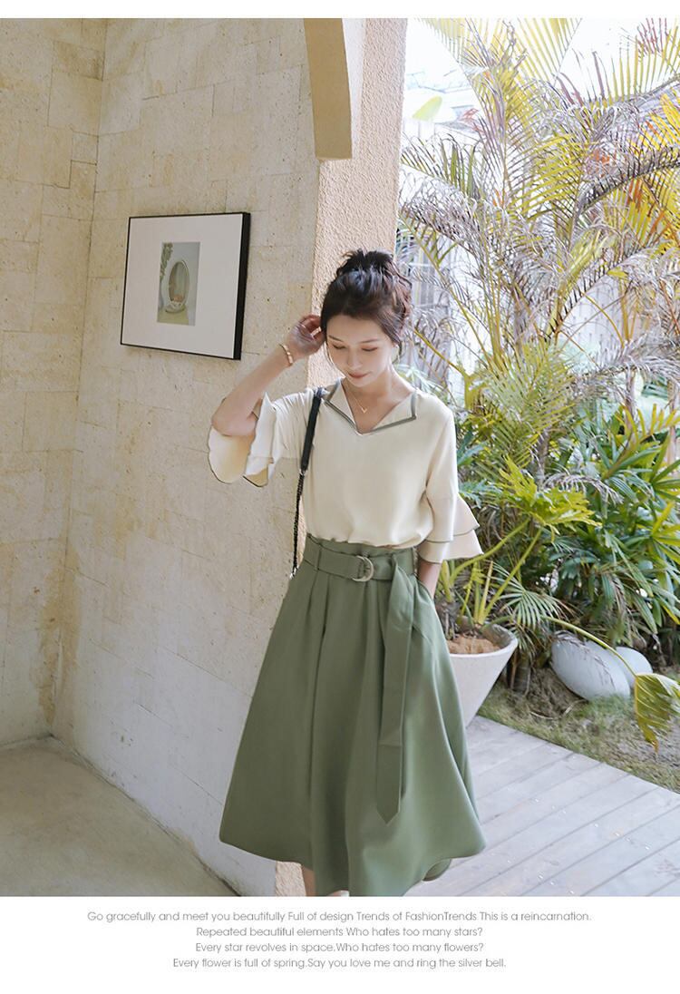 春 秋 レディース セットアップ トップス スカート ハイウエスト 7部袖 おしゃれ 清楚 シンプル カジュアル ベージュ 青 緑 3カラー 大きいサイズ 体型カバー ゆったり 韓国 きれいめ プチプラ YN-7-23 | dress_sugar_moon