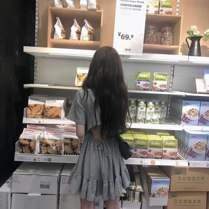 春 夏 レディース ワンピース バックシャン フリル ミニ丈 半袖 ブラック グレー カジュアル 韓国 可愛い AM-1-61