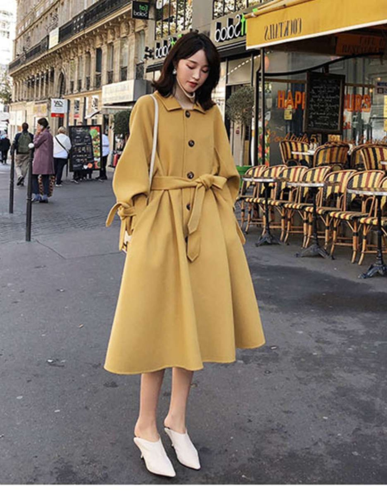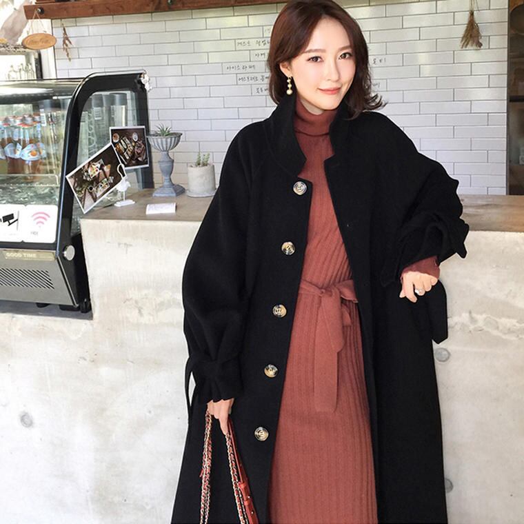 秋 冬 レディース コート トレンチコート ロングコート ミドル丈 原宿系 ハイウエスト ウエストベルト リボン フロントボタン バルーン袖 ふんわり 可愛い 大人 きれいめ 黄 黒 緑 3カラー 大きいサイズ 体型カバー ゆったり 韓国 きれいめ プチプラ YN-7-106 | dress_sugar_moon