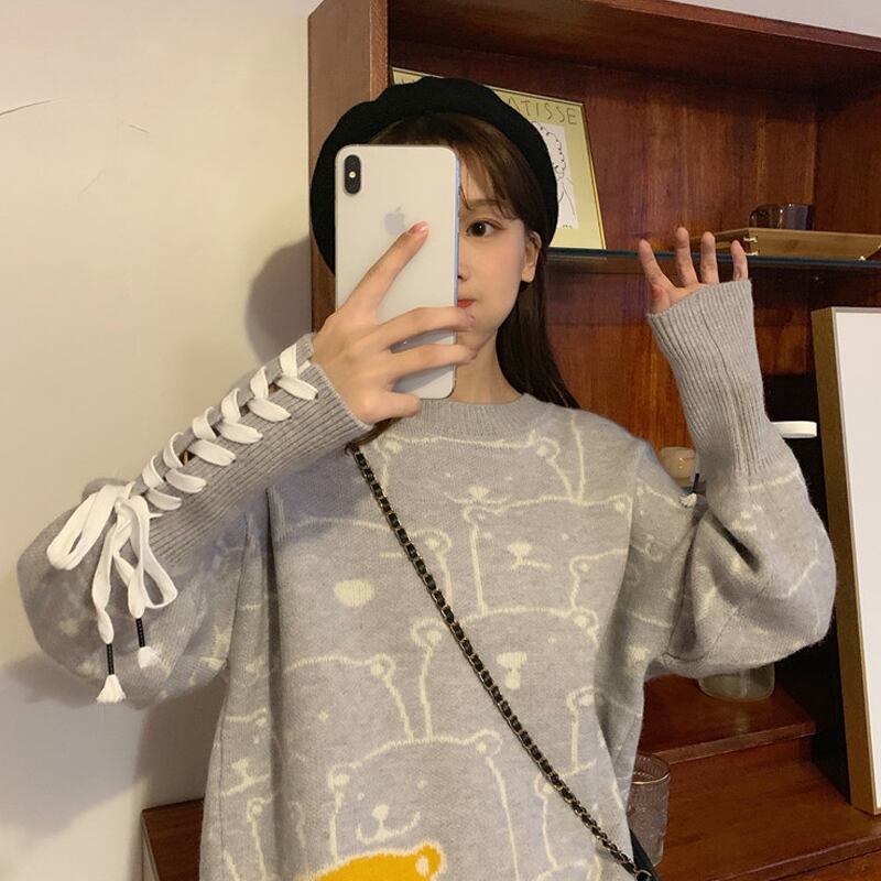 クマ柄と袖のレースアップデザインが可愛い