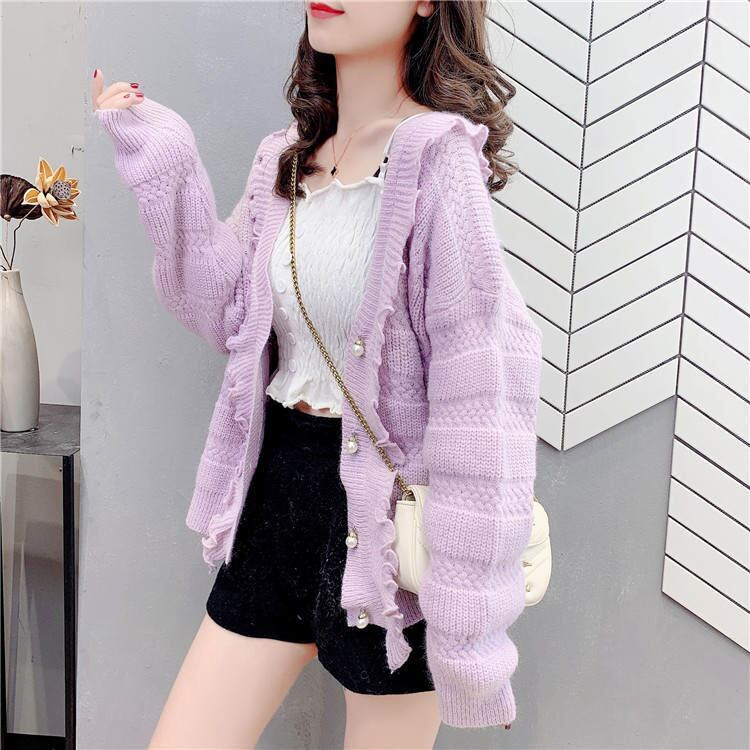 秋 冬 レディース アウター カーディガン シンプル おしゃれ 可愛い 清楚 フリル フリフリ パール ボタン 青 白 紫 3カラー ワンサイズ 韓国 きれいめ プチプラ YN-9-38 | dress_sugar_moon