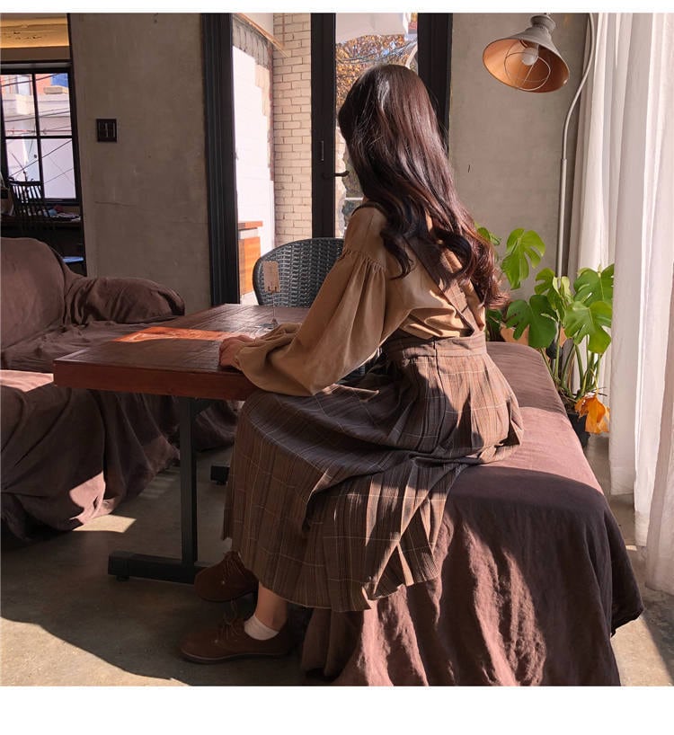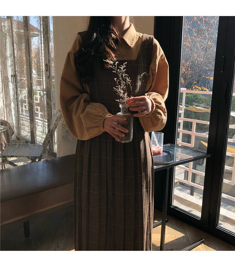 秋 冬 レディース ワンピース セットアップ ブラウス シャツ 茶 ワンカラー チェック 格子 ガーリー 大きいサイズ 体型カバー ゆったり 韓国 きれいめ プチプラ YN-9-12 | dress_sugar_moon
