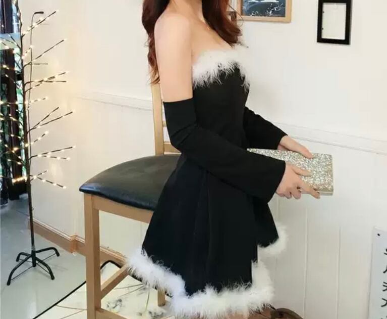 秋 冬 レディース ワンピース ミニ丈 膝上 フレアワンピース スリム もこもこ チューブトップ 大人 可愛い セクシー サンタ クリスマス Xmas CHRISTMAS ホームパーティー デート 黒 赤 白 3カラー ワンサイズ 韓国 きれいめ プチプラ YN-11-3 | dress_sugar_moon